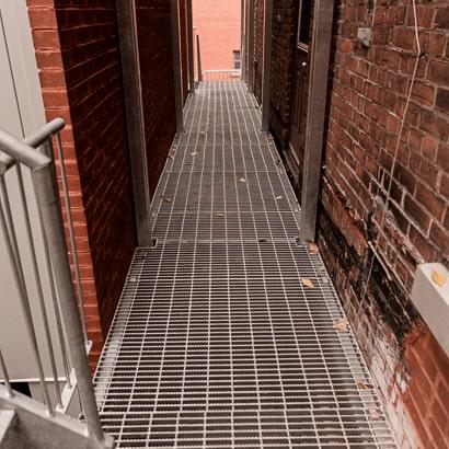 Pour les nouveaux bâtiments ainsi que pour la structure rénovée, des escaliers de secours et des passerelles ont été conçus et installés. Ces structures garantissent non seulement la sécurité des occupants en cas d'urgence mais facilitent également la circulation entre les bâtiments, renforçant la cohésion de l'ensemble architectural.